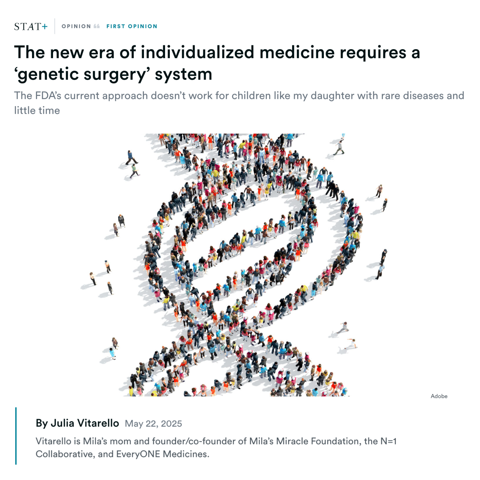 In his book, “Blind Spots,” new FDA Commissioner Marty Makary wrote that challenging the norm in medicine is difficult but necessary. We are clinging to the traditional ways patients have accessed medicines, but the status quo is neither working nor acceptable. History has shown us that a big break from the past is possible when there’s a moral imperative. Today, that’s exactly what we face: Tens of millions of children around the world are dying of genetic diseases. Yet in the seven years since milasen, only a few dozen children have been treated with individualized medicines, many of whom saw dramatic reduction in seizures and improved mobility, and in some cases, with earlier intervention, little to no further disease progression.